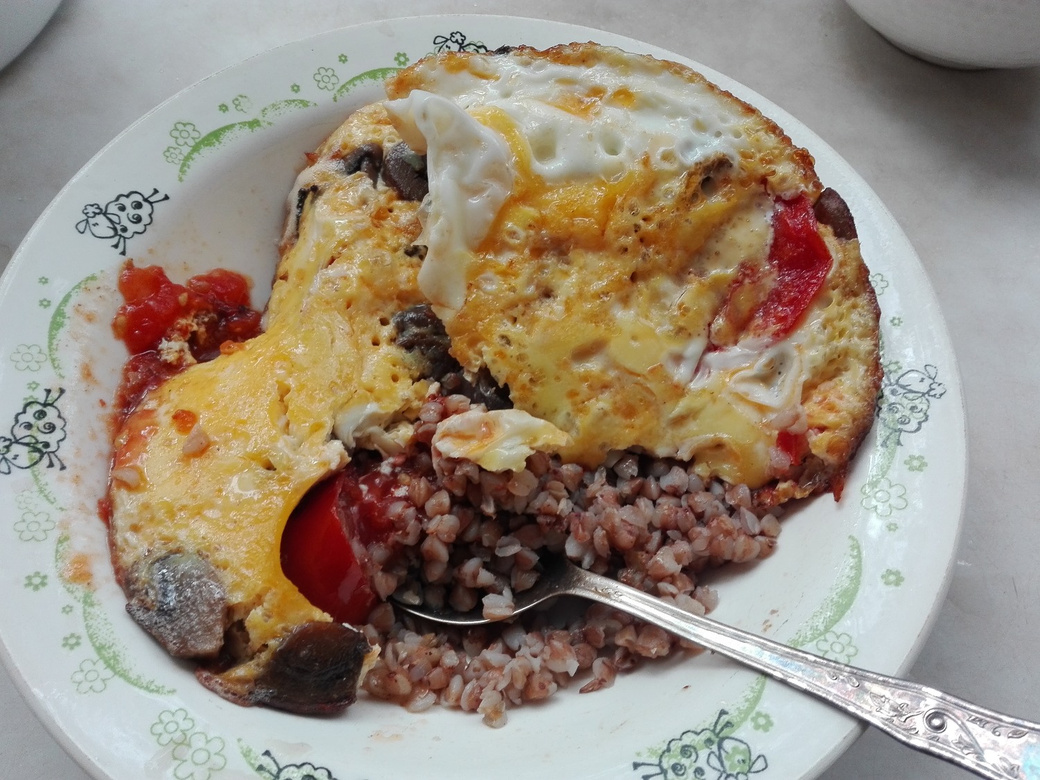 Как насчёт яичницы с грибами и помидорами, в тарелке с гречневой кашей?