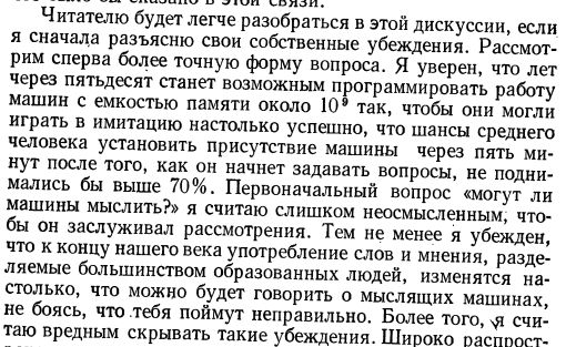 Вложение 18494 Чуть выше в тексте, автор даёт определение, что под "ёмкостью памяти" он понимает "логарифм числа состояний по основанию 2". Таким образом, ёмкость 10^9 надо понимать, как память, с числом состояний 2^(10^9), что соответствует 1Гбит. Или 128 Мб. Причём, ЕМНИП, в тексте нет разделения на тип памяти, иными словами - по большому счёту, не важно: будет ли достигнут данный объём за счёт гигантских свопов на винт, требуется ли огромная скорость доступа (а-ля кеш цп) или можно шерстить БД на SSD. Думаю, автор опускает технические детали по причине актуального уровня развития техники (1950), её проникновения в жизнь, и, как следствие, степени компьютерной грамотности широкого круга читателей. |