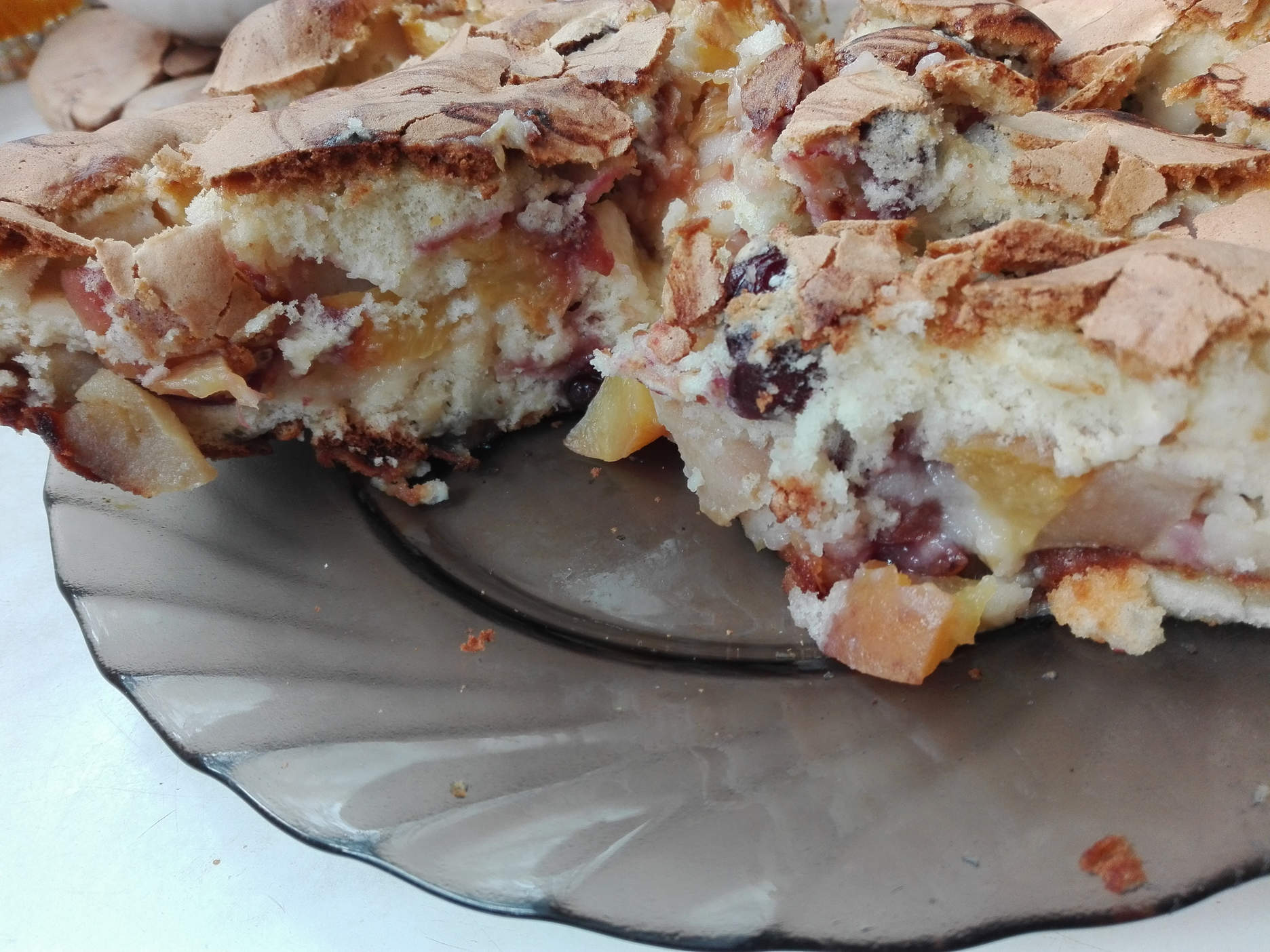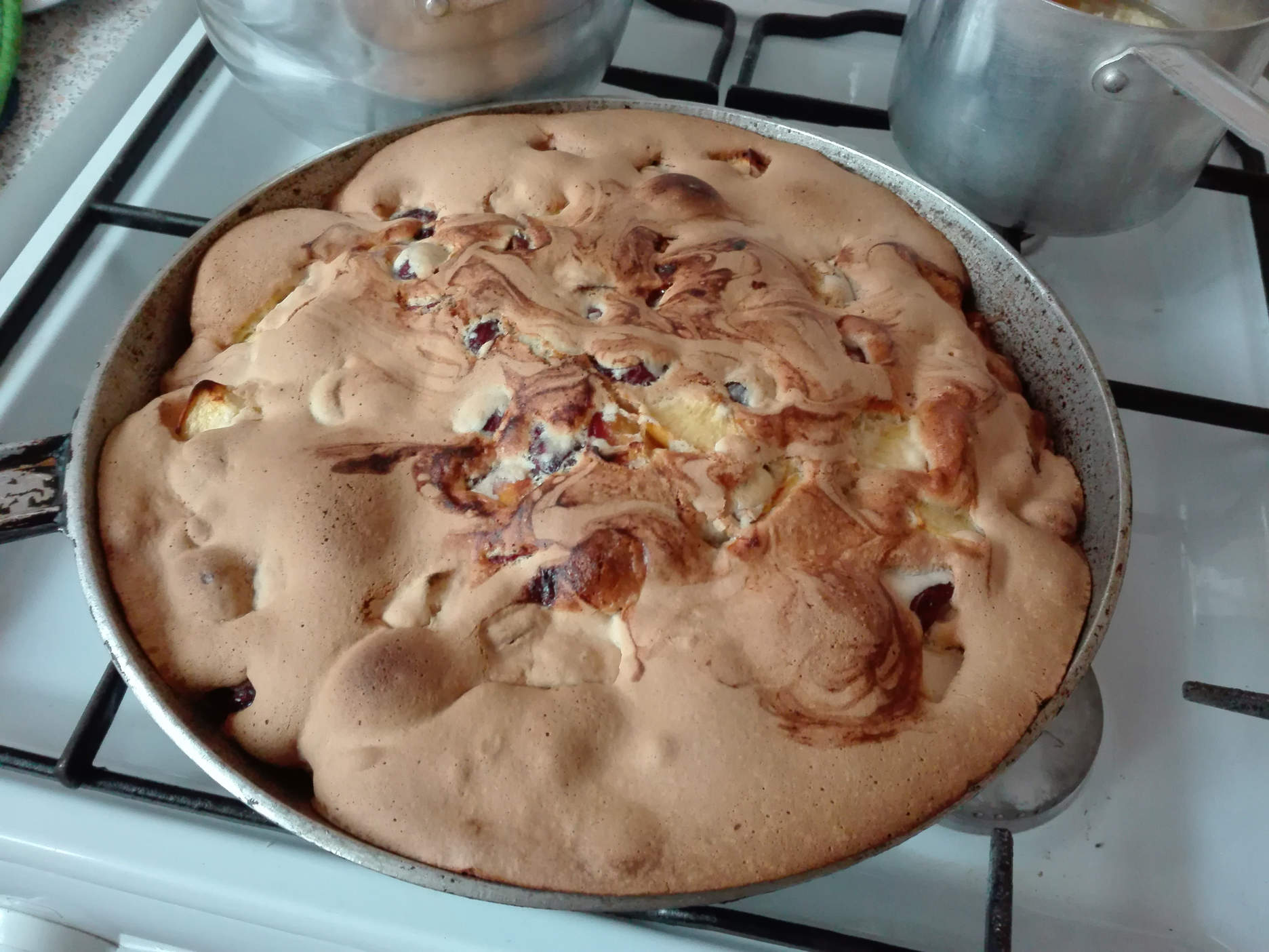 Экспериментально дополнил шарлотку персиками и черешней: От сочных персиков (хотя старался твёрдые брать) и ягод вышло много влаги, тесто выпеклось, но пока снимал со сковороды десерт раздряб. На вкус отлично :super: 4 яйца, ~200 грамм муки и сахара, ванилин + немного разрыхлителя. Начинку заливать сверху, и 45 минут в духовке при ~240°. Быстро (относительно) и вкусно, надо было давно так сделать :dontknow: Вложение 22721Вложение 22722Вложение 22723Вложение 22724 Ещё отлично шарлотка заходит с корицей (только яблоки, с остальным не рискнул), или какао. Цитата: