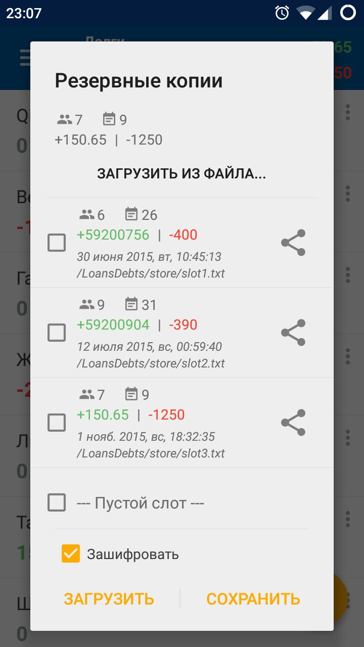 * переделка внутренней структуры (адаптеры для списков и т.п.). * причёсывание вида окошек. * новые фичи - гасить всю сумму в 1 клик, пароль на вход (ещё не готов). Также переделал форму для бэкапов. Сделал возможность поделиться файлом, так что теперь можно сливать на дропбокс или в почту не выходя из проги. Плюс сделал импорт из файла, чтобы можно было из любого места выбрать файл с данными. Но тут вырисовывается перегруженность окошка, смотрите сами. Вложение 22018 на картинке: * заголовок * инфа о текущем количестве контактов / операций / денег * кнопка "загрузить из файла" - открывает системный выбиратель файлов, если он есть * слоты (10 шт, было 3) - у слота есть кнопка Поделиться, которая открывает системный sender для текстовых файлов * галка Шифровать, которая шифрует путём сдвига байтов, лишь бы "простой человек" не прочёл * кнопка Загрузить - импорт из указанного слота * кнопка Сохранить - экспорт в указанный слота Нужен совет - что бы вы тут поменяли / упростили? Мои мысли: убрать слоты совсем. рядом с текущими значениями воткнуть Поделиться. ниже - Загрузить из файла. в момент нажатия на поделиться сохранять файл всё в ту же папку /store/ с именем типа loansdebts_backup_2015-11-02_12-07.txt. при закрытии окна бэкапа удалять этот файл, наверное. плюсы: * упрощается восприятие окна минусы: * нет предпросмотра ранее сохранённых слотов * если решу очищать папку /store/ при закрытии проги, то и все слоты из старых версий удалятся (хотя тут можно по маске в имени файла проверить) * разрыв шаблона - были слоты и пропали! могут схватиться за сердце, подумав что инфу потеряли. Минусы эти можно сгладить, написав подсказку - "раньше были слоты, они лежали в папке такой-то, теперь вы можете загрузить их через 'Выбрать из файла', бла-бла". И можно сделать файл last_backup.txt, который не будет удаляться, и на форме показывать Последний экспорт, с возможностью загрузить его. Ну и новости по загрузкам Вложение 22019 |