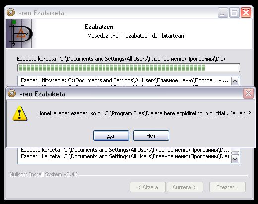 А это другой пример. Инсталятор программы Dia имеет всего несколько языков, среди которых английский (что позволяет без проблем установить ПО). Внутри программа локализована на множество языков (среди которых русский, определившийся автоматически). Деинсталятор говорит с пользователем исключительно на баскском.