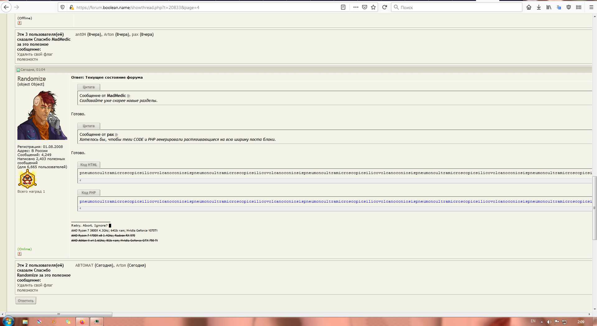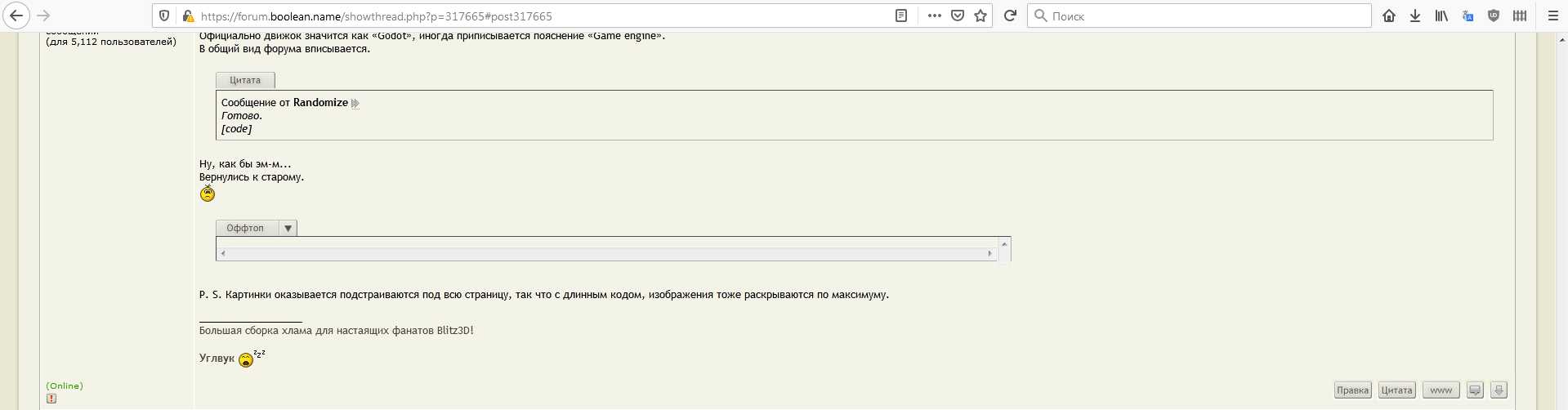 Нормально отображается только в обычном режиме просмотра. Randomize вроде уже сел писать новый форум, а старый пока так, на костыля стоит. Цитата:
