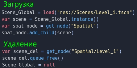 var scene_del = get_node("Node//Level_1")Попробуй у себя сделать удаление так: Код: