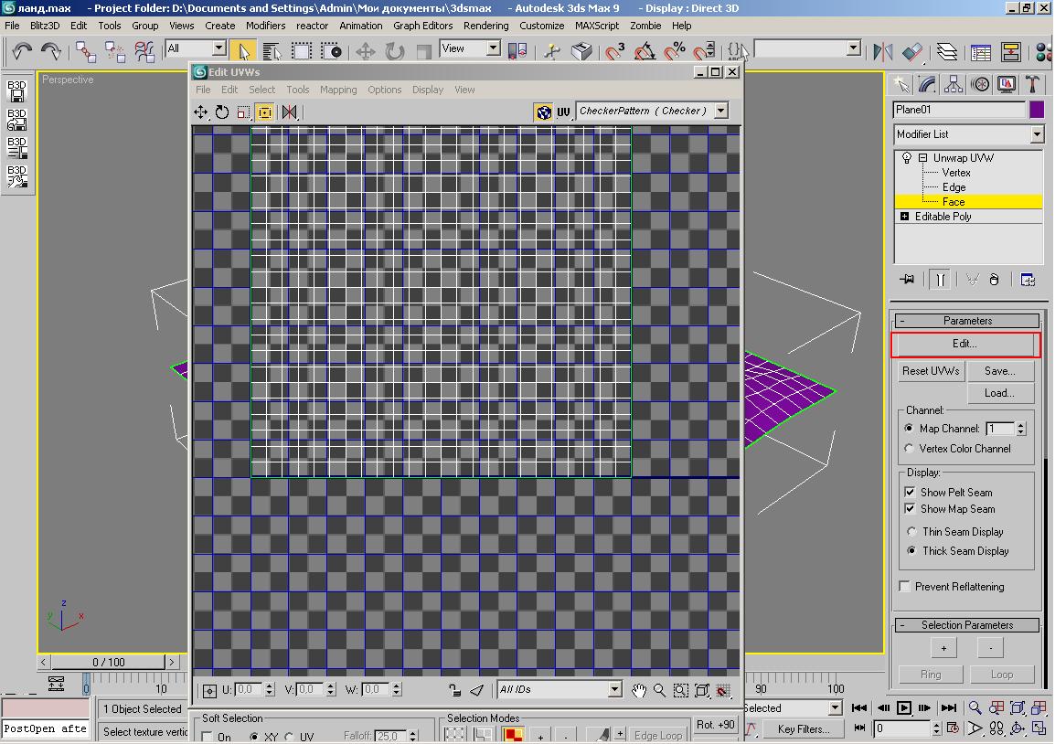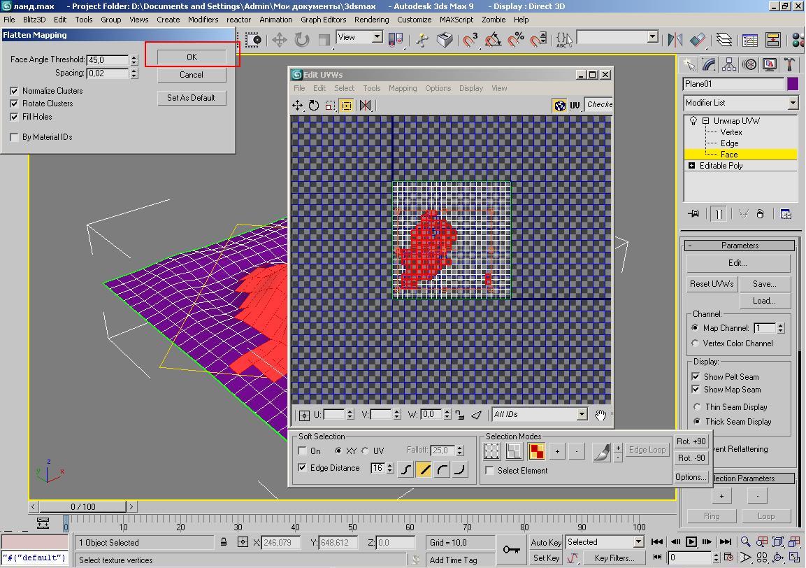 Текстуринг ландшафта №1(очень некрасивый) 1)Это очень некрасивый способ.Но раз я уж начал писать уж допишу. Открываем наш созданный ландшафт. И применяем к нему модификатор UnwrapUVW и выбираем способ редактирования Face. Вложение 10900 2)Теперь жмем кнопочку Edit.здесь у нас наш ландшафт. Вложение 10901 3)Далее выделяем те полигоны которые составляют нашу гору.Выделили? Вложение 10902 4)Жмем Mapping->Flatten Mapping. Вложение 10903 5)Открывается менюшка.Там ничего не меняем и просто нажимаем ОК. Вложение 10904 6)В итоге получилась вот такая штука.Всю текстуру нам надо будет поместить вот в этом выделенном квадратике( рис.ниже). Вложение 10905 7)После того как я выделил луг и дно реки и использовал к ним Flatten Mapping, можно маштабировать крутитть,перемещать все это.Только бы все уместилось в квадратик. Вложение 10906 8 )Все вы поместили все в квадратик.Теперь жмем Tools->Render UVW Template. Вложение 10916 9)Тут появляется менюшка.Выбираем Width , Heigth:2048.Лучше делать развертку большим размером,впоследствии мы все равно сможем уменьшить размер уже готовой текстуры.Жмем Render UVW Template.И готовую картинку сохраняем в любом формате,только бы открылся граф.редактором. Вложение 10917 10)ВОт теперь грузим полученную развертку в фотошоп и тут текстурим. Вложение 10907 11)Вот получилась у меня такая текстура. Вложение 10908 12)Теперь можно изменить размер текстуры.Жмем Изображение->Размер изображения и там в первых двух строчках вводим размер,например 256х256. 13)В максе применяем к нашему террайну текстуру и получается вот такая крокозяба. Вложение 10909 Итог:Я понимаю,что в сто раз проще просто выделять нужные полигоны и применять к ним нужную текстуру и получиться тоже самое,но так мы смогли сделать несколько текстур в одной. |