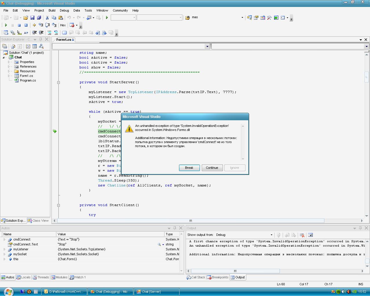 Почему когда я запускаю приложение из компилятора (F5), после нажатия кнопки "подключение" в приложении (это интерент чат), выдаёт ошибку