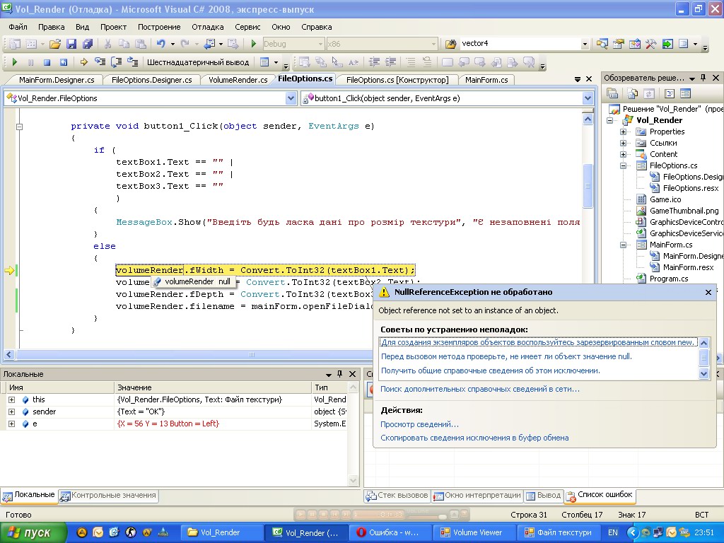 Я решыл не создавать другую тему а написать в етой. Так вот: Я хочу передать значение с TextBox(a) в переменную соседнего с формой класса. То есть с (FileOptions : Form).textBox1.Text -> (VolumeRender : MyClass).fWidth Я сделал: Код: