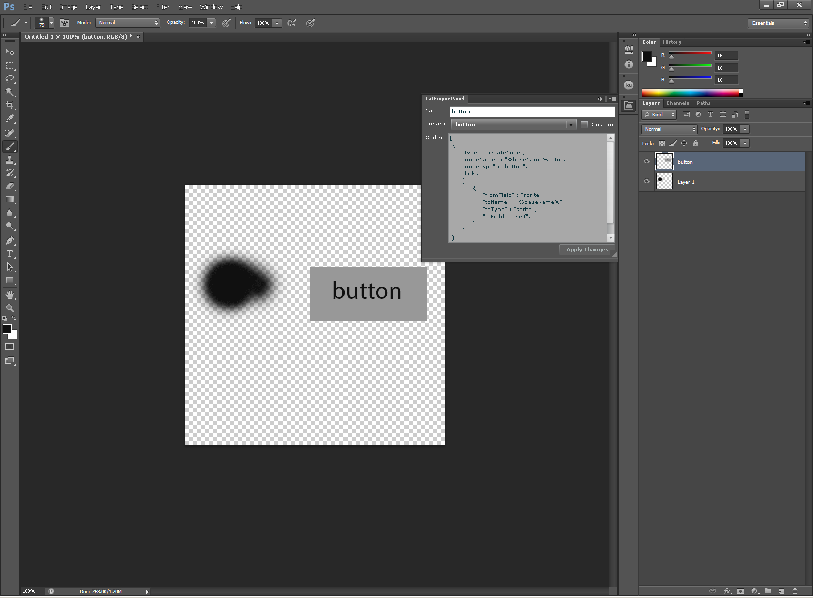 проще всего оказалось разработать дополнительную панель для фотошопа, они разрабатываются на смеси флеша и javascript :crazy: в общем у меня ушло около 10 рабочих часов на панельку, куча геморроя с перекидыванием данных из actionscript в javascript и обратно (они там через xml перекидываются, base64 от текста надо брать, потом оказалось что кодировщик base64 вставляет перенос строки каждые 76 символов бл*ть, и всё ломалось) чтобы разрабатывать панель вам понадобится фотошоп cs5+ (cs4 по-идее тоже должен работать), flex builder 3+, flex sdk 3.6 (какого хрена оно отдельно от билдера я не знаю, но надо качать последний), adobe photoshop sdk cs5 (только он, в cs6 сдк уже удалили семплы флеш панелей и кинули их хрен знает куда) выглядит в итоге это так : 1) у слоя указываем пресет button и он становится кнопкой Вложение 17554 2) у слоя указываем пресет альфа анимации и он становится будет анимироватся Вложение 17555 3) експортим из фотошопа и импортим в свой редактор, всё, теперь у нас и кнопка и анимация Вложение 17556 кухня внутри : сама панелька генерирует слою поле метаданных tatengineMetaData, те все пресеты и их параметры в итоге просто генерят текст, сам генератор описан в TatEnginePanel.jsx, если поставить флаг custom то генератор отключится и мы можем писать любой код уже руками (чисто для программистов фишка) tatengineMetaData в export.json называется metaData и кодируется в base64 чтобы не было проблем, вы можете её вешать на текст, группу или обычный слой осталось только вам в вашем редакторе написать скрипт импорта, мы используем json формат команд для импорта как устанавливать : TatEnginePanel.jsx и swf нужно положить в plugins\panels, а tatengine_export.jsx в presets\scripts |