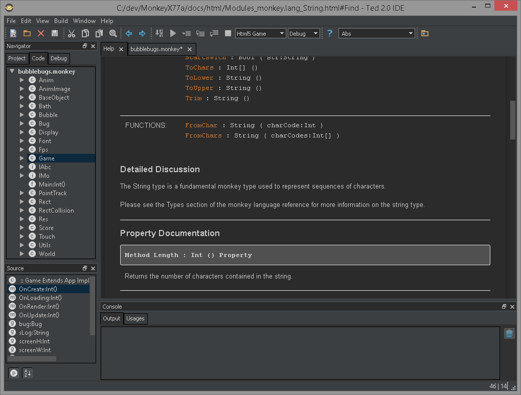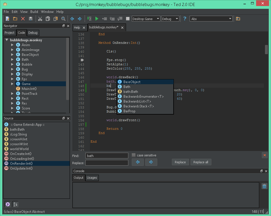 Представляю вашему вниманию усовершенствованную версию редактора Ted v1.17, которую я назвал "Ted 2.0 IDE". Вложение 20233 Несколько картинок: Описание особенностей: Страничка проекта: http://fingerdev.com/ted20/ Скачать: ted20_v1.0a (21 Mb) Как видно из описания, сделано не всё что задумано. Выкладываю эту альфу в связи с тем, что у меня сейчас нет времени заниматься дальнейшей разработкой, чтоб добро не пропадало. В дальнейшем, если удастся доделать анализатор кода, предложу эту версию в качестве дефолтной среды для Monkey. UPD: для корректной работы анализатора нужно заменить табы на 4 пробела. |