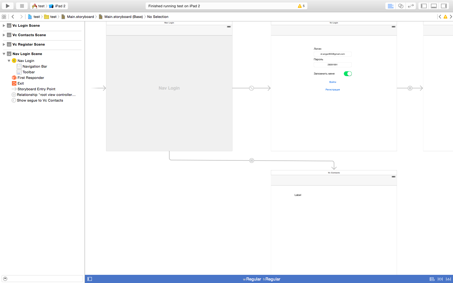 vcContacts *vc = [[vcContacts alloc] init];Navigation controller я имею, из него открывается основное окно (relationship root view controller), на котором есть кнопка "войти" выполняющая ajax-запрос на сервер и, в зависимости от результата, открывает окно или выдаёт Alert. Выглядит это всё примерно вот так: Вложение 21685 Нужно открыть нижнее окно (vcContacts), segue от navigation controller до этого окна повесил уже надурнину, потому что ни один вариант не сработал. |