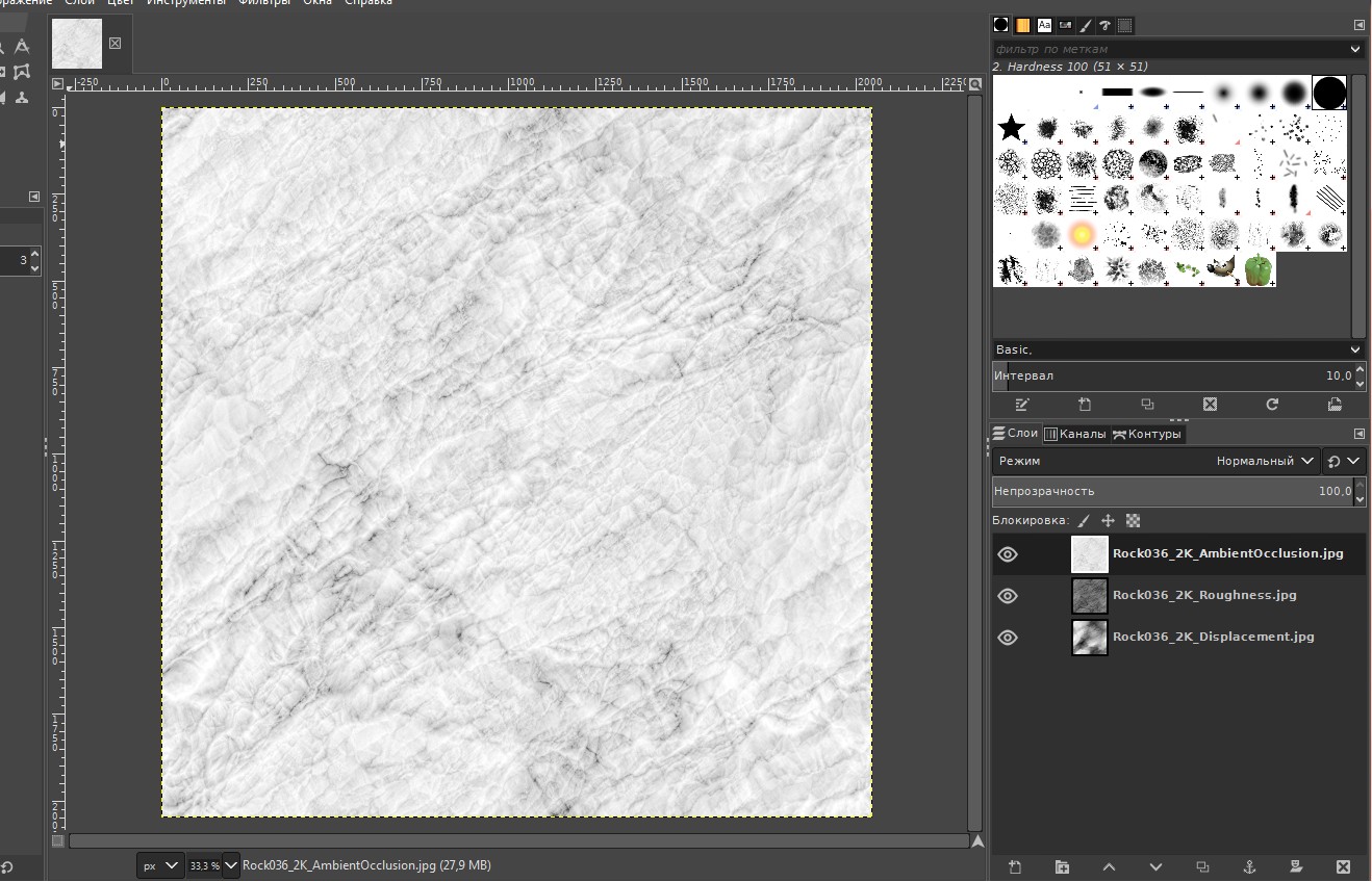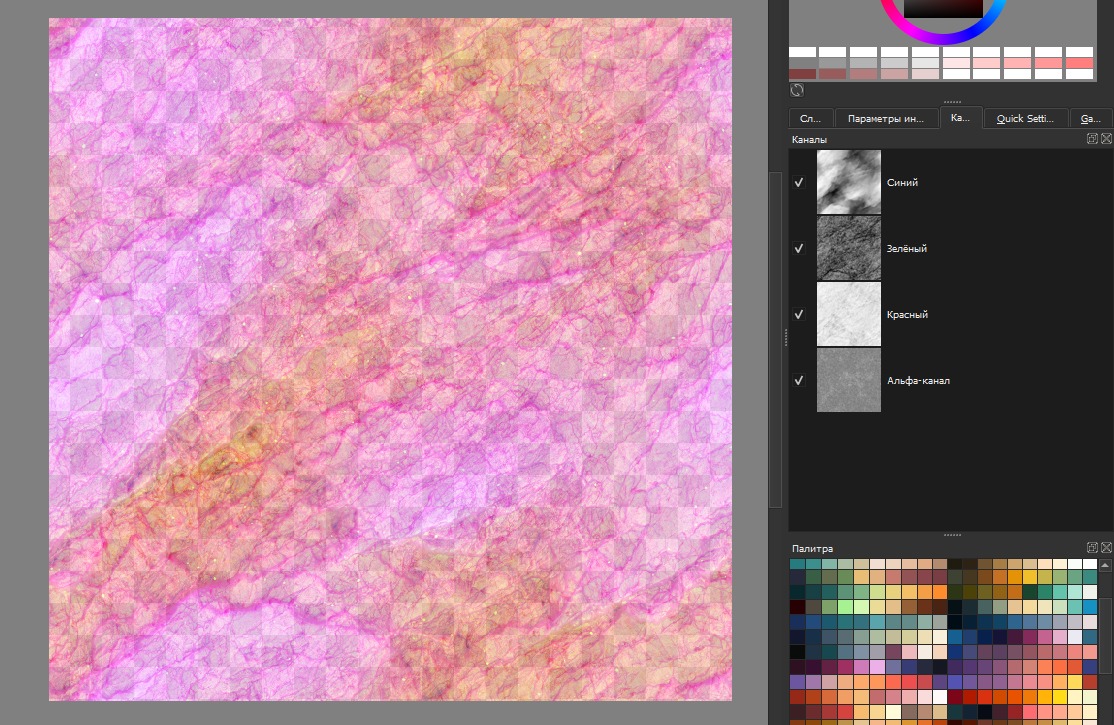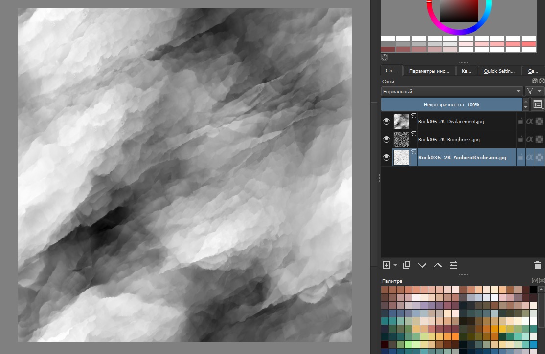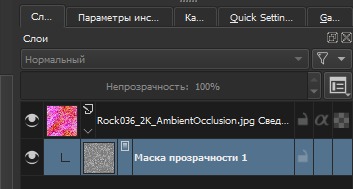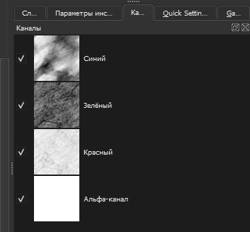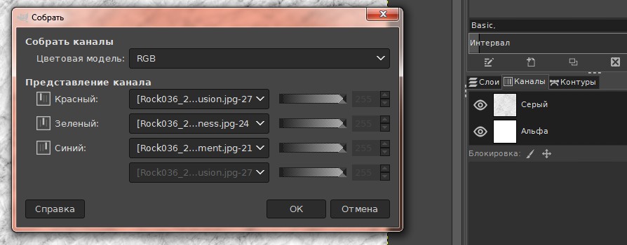 Дополнение, как добавить альфа-канал. Если ЧБ текстуры 4, то последнюю можно добавить в канал прозрачности. Но сначала нужно слить все слои. Теперь добавляем четвёртое изображение. Правой клавишей на слой — Преобразовать (Convert) —> в маску прозрачности (to Transparency Mask). Выбранный слой перемещается к нижнему слою и становится маской, а текстура приобретает полупрозрачный вид. Вложение 23166 Ещё раз жмём правой клавишей на него (маску прозрачности) — Отделить альфа-канал (Split Alpha) —> Записать как альфа-канал (Write as Alpha). (Довольно не очевидно) Теперь у нас один слой, маска записалась в альфа-канал (он перестал быть белым): Вложение 23167 =====GIMP===== С ним всё сложно, я уже не хотел писать про него. Но всё же решил добавить как задумывал изначально. Проблема в том, что я так и не понял как редактировать и сразу видеть результат. Но всё же, его можно использовать для быстрого сведения в каналы. Быстрый способ! Перетаскиваем нужные ЧБ текстуры в GIMP. Каналы в нём отображаются наоборот, по этому располагаем снизу вверх — Displacement, Roughness, Ambient Occlusion Вложение 23169 Изображения чёрно-белые, по этому Гимп скорее всего автоматически включит режим градации серого. Проверьте или измените — Изображения —> Режим —> Градации серого. После этого во вкладке Каналы будет один серый, и один альфа. Затем объединение — Цвет —> Составляющие —> Собрать. В открывшемся окошке можно проверить на какие каналы отправятся слои, а так же выбрать цветовую модель (RGB, RGBA и т. д.): Вложение 23170 GIMP по умолчанию выберет тот порядок что я написал выше. Нажмите OK, и у вас создастся новая вкладка-проект со сведёнными каналами в один слой.
