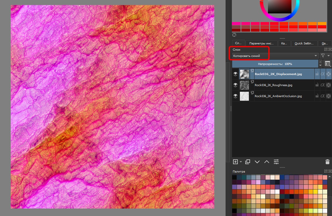 =====Krita===== Допустим, у нас есть три ЧБ текстуры для PBR-материала, Ambient Occlusion, Roughness, Displacement. А может быть это просто вспомогательные изображения для вашей игры, в любом случае, их было бы здорово поместить в каналы одной текстуры. Тем самым немного сэкономив на памяти и времени загрузки. Работать с каналами в Крите удобно и просто. Создаём новый проект, 2048x2048 (разрешение текстуры), или сразу перетаскиваем файлы как слои в один проект. Располагаем их в нужном порядке. Во вкладке «Каналы» (Channels) цвета располагаются снизу вверх, Красный, Зелёный, Синий. По этому для удобства, я так же расположу текстуры по слоям, снизу вверх — AO, Roughness, Displacement: Вложение 23163 Теперь слои надо смешать (во вкладку каналов лезть не надо). Нижний не трогаем, берём средний слой, он будет «зелёным» (Roughness). Выберете список над слоями, тип смешивания — Копировать зелёный (Copy Green). Повторите для верхнего (Displacement) слоя — Копировать синий (Copy Blue). Вложение 23164 Готово! После этого во вкладке «Каналы», можно увидеть что слои встали на свои места: Вложение 23165 С каждым таким слоем-каналом можно работать как обычно, все изменения сразу будут видны. (К примеру сдвинуть и получить эффект аберрации) Теперь можно все слои слить вместе, или сразу сохранить в искомый формат.