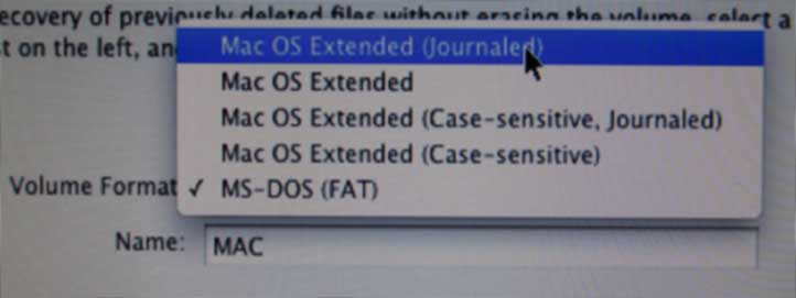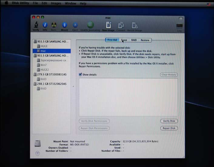 Здесь находим в списке слева наш диск, если он пустой то выделяем его, правой кнопкой кликаем в меню выбираем Mount чтобы присоединить диск (если он серый). Потом в панели справа жмём Erase.