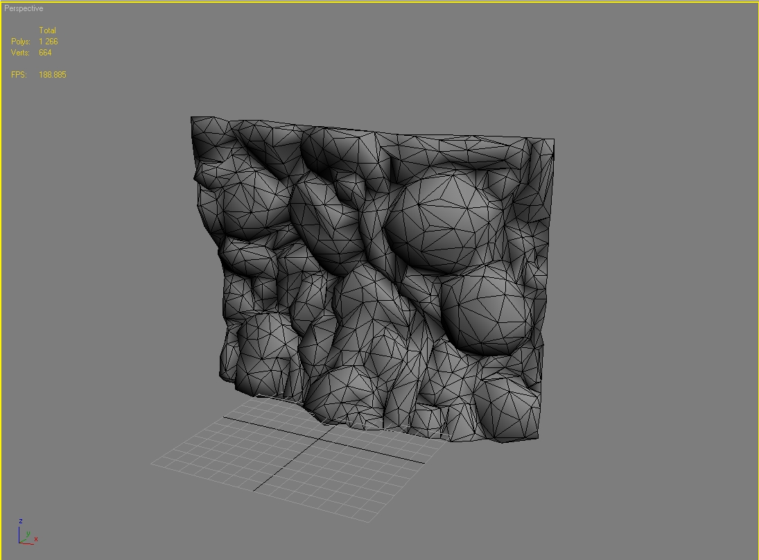 Сетку всей пещерки показать не могу потому что собиралась она в редакторе, в максе делались составные части (своего рода тайлы из моделей ), собственно сетка одной части стены (знаю поликов конечно можно было бы подрезать, но это баланс между кол-вом поликов и геометрией