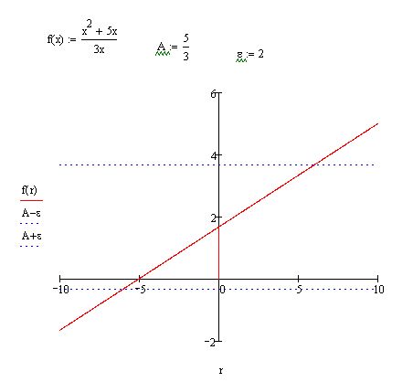 * меняется от a-d до a+d, т.е. от -5 до 5, при этом значения функции не отклоняются от A более чем на эпсилон, т.е. лежат от 5/3-2 до 5/3+2.