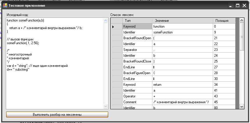 Пока частично написал лексический анализ, в приложении есть тест. Находит числа, строки, операторы, комментарии, скобки, идентификаторы. (приложение требует наличия NetFramework 3.5)