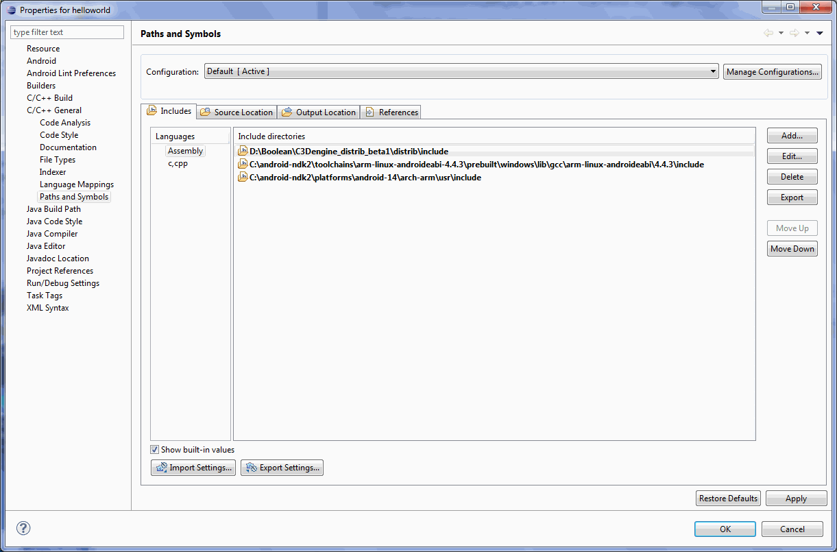 в путях проекта указаны только пути к движку и к ндк. Ещё добавил путь к MinGW - не помогло.