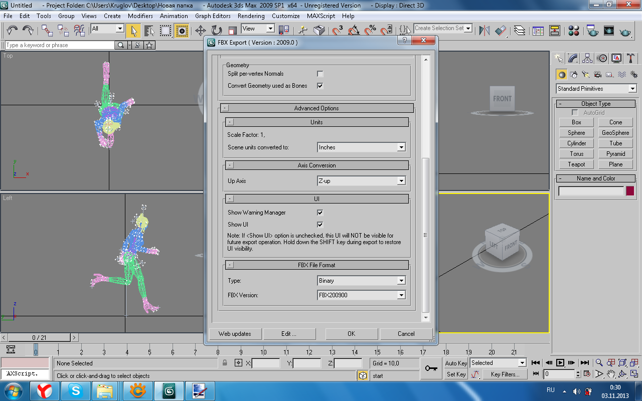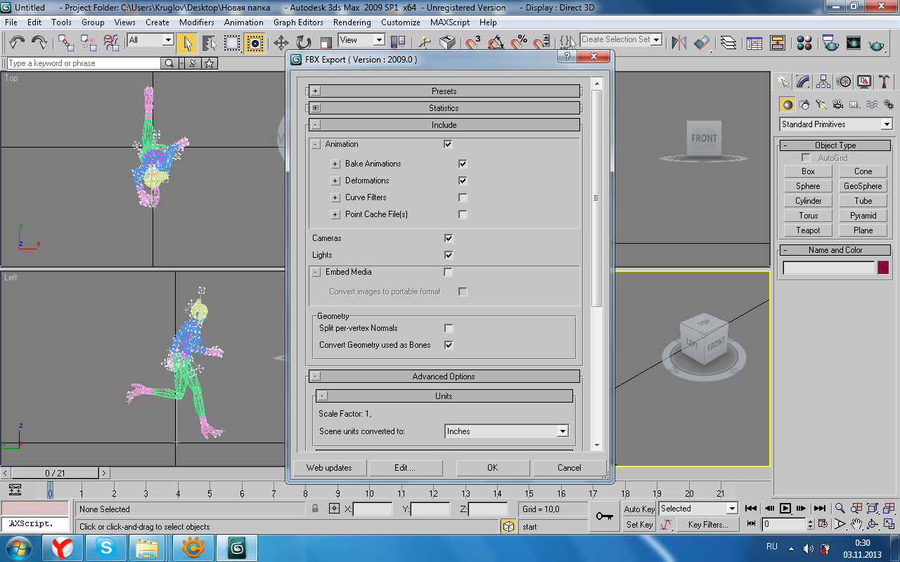 У меня 2009-ый макс. Закрывал, открывал, сохранял и всё равно перекорюченая вся. Все шаги сфоткал, посмотрите пожалуйста, может быть в настройках что-то не так?