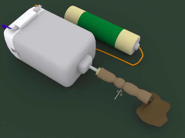 Далее мне захотелось в небо. Я нашел в сарае пушку на колесах. Пушка была оторвана, токарный станок для пластилина был разобран и приделан к колесной базе. Так же был с любовью выпилен и выдолблен из дерева пропеллер. Далее на моторчик был насажен пропеллер при помощи обрезка пастика от шариковой ручки подплавленый спичками что бы влез на кончик моторчика. Пропеллер был настолько ущербный, что от вибрации эта конструкция катилась по столу и я представлял, что это вот вот взлетит!