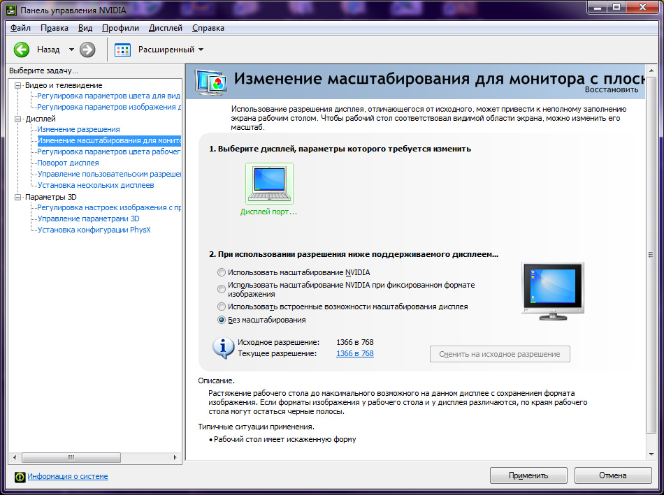 Но, как оказалось так вовсе не на всех мониках. На моем новом например какое бы разрешение не было у полноэкранного приложение - оно все ранво растягивается и чтобы это поправить приходится специально рыться в настройках.