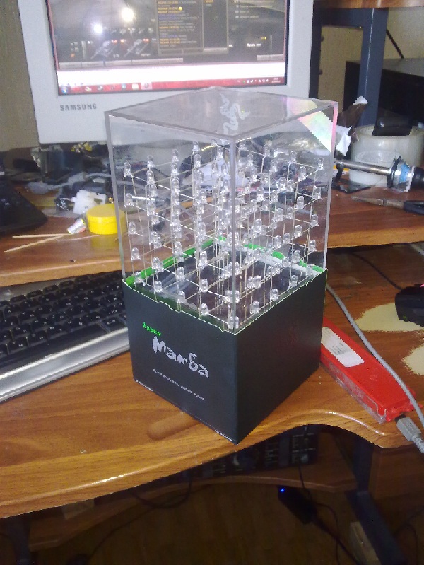 Но распайка платы была 1/10-й частью беды. Нужно было сделать форму под слои куба (слой - 5х5 светодиодов). Дрель в руки и вперёд. Форма была размечена и рассверлена довольно таки быстро, после чего я приступил к сборке/пайке слоёв. Спустя где то 3 часа напряжённой перепайки слой за слоем этого безобразия и доведения до более-менее ровных размеров куб был спаян. Тут же возникла проблема - а куда его пихать? Ведь в одном слое 25 светодиодов, а это 25 проводов + 5 проводов (на каждый слой по проводу). К счастью незадолго до этого мною была приобретена "чудо-зверь" мышь Razer Mamba 2012, пластиковую упаковку от которой и решено было использовать.