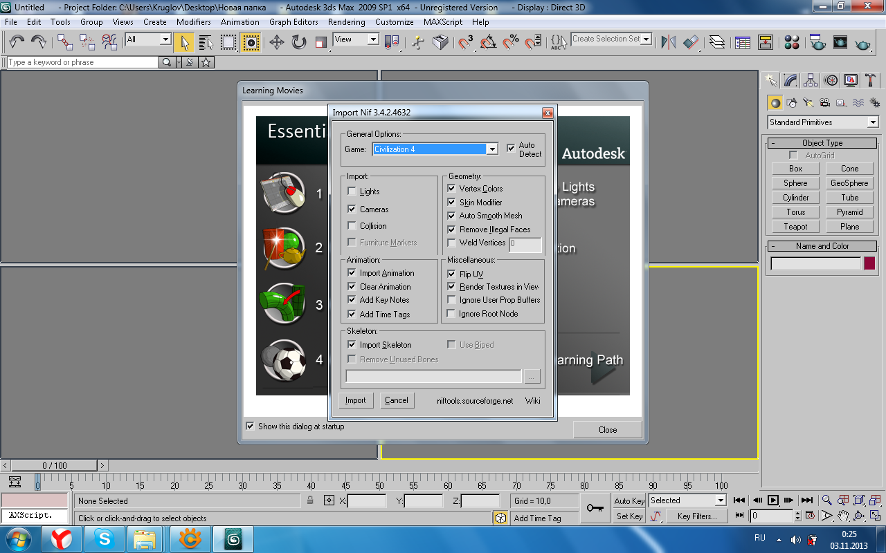 nif плагин для Макса слегка глючит. Корежит модель иногда. Обязательно перед импортом/экспортом нужно закрыть/открыть макс. Одну анимацию импортнуть/экспортнуть. Снова закрыть/открыть макс.