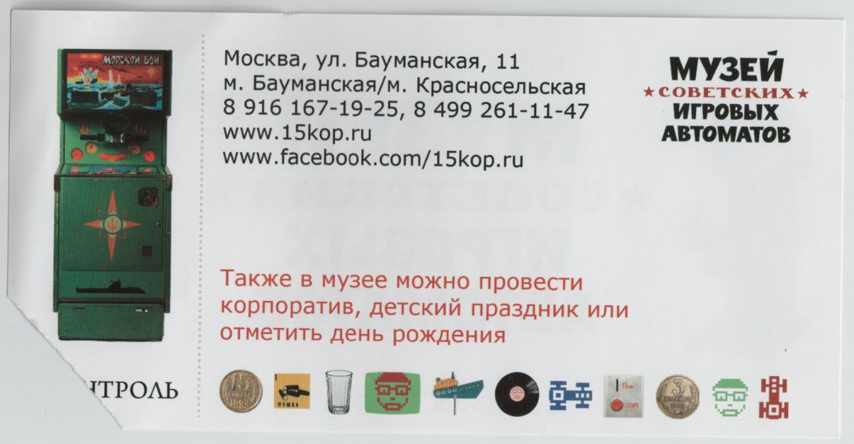 При покупке билета вы получаете не только вышеприедённую формальную бумажку, но и аккуратный кулёк с 15-копеечными монетками советского образца. Последние тратятся на игры в автоматах.