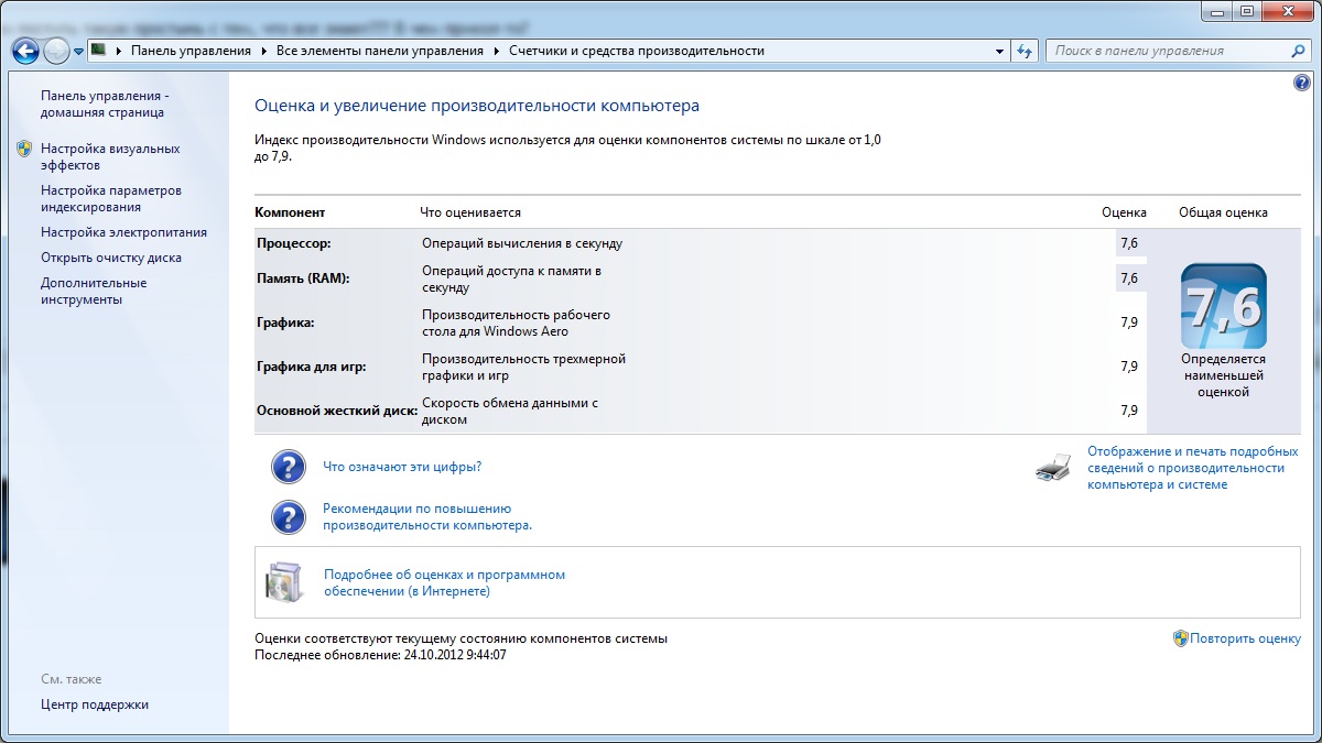 У меня в таблице винды по производительности процессор, память и графика для игр выше семёрки, а просто графика и жёсткий диск меньше шестёрки. Ну жёсткий диск не SSD, с ним всё понятно, а вот что винде с графикой не нравится? Написано, что подразумевается производительность рабочего стола для Windows Aero. Это чо, ГТА 4 у меня идёт, а рабочий стол лагает типа?