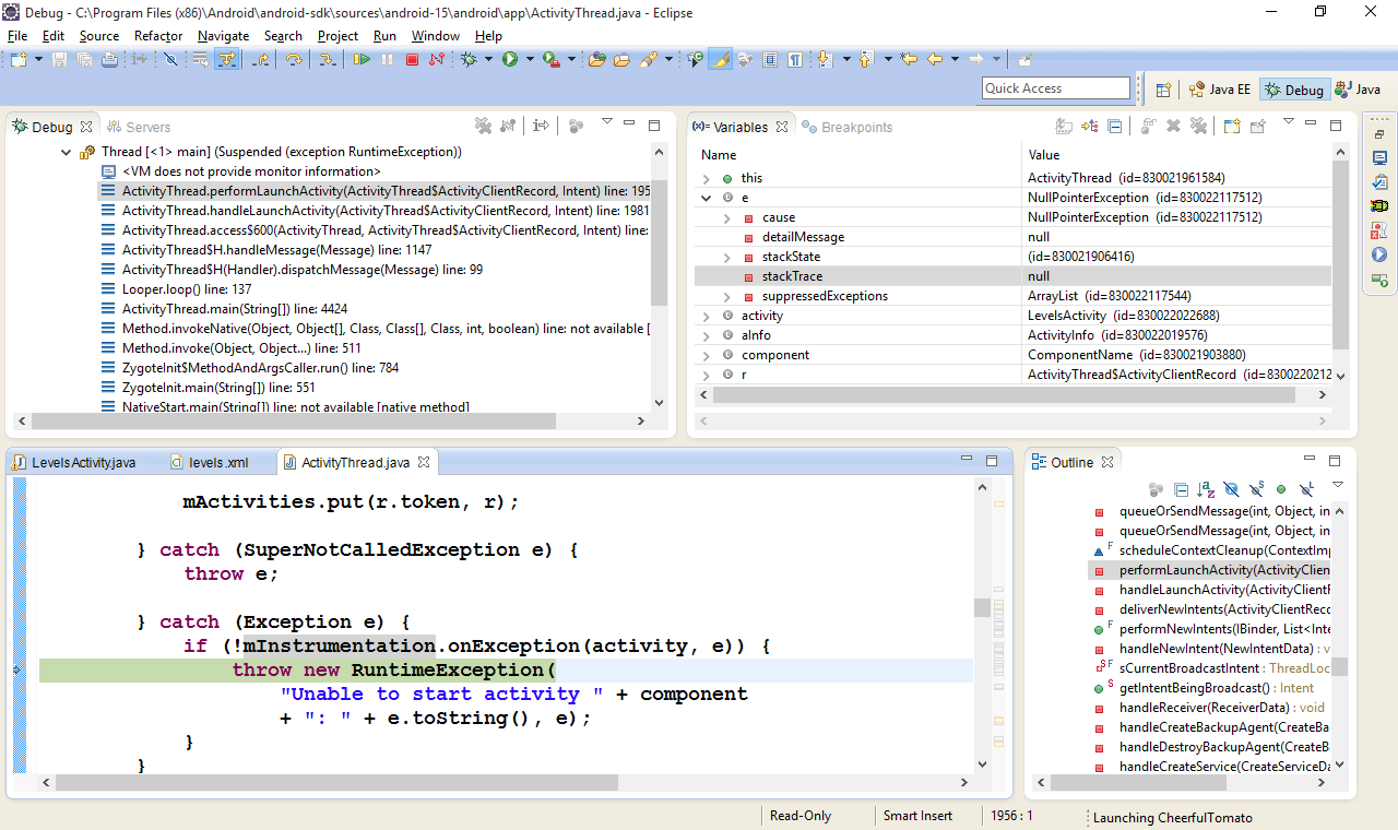 Программа хорошо компилируется, но при запуске вылетает и выдает в LogCat ошибку: