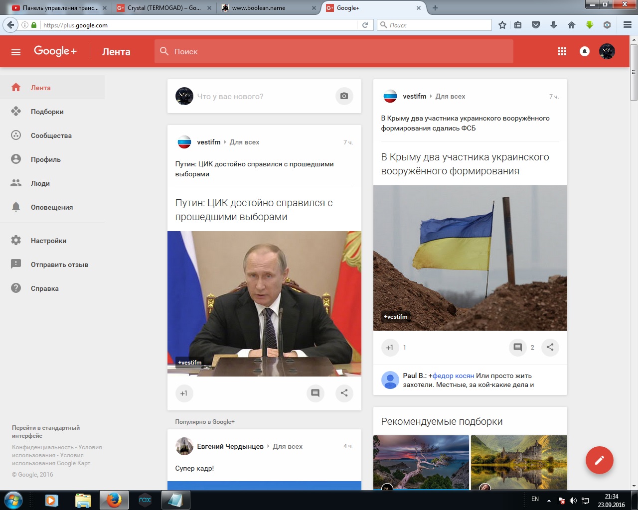 В наше время не пользоваться социальными сетями не возможно... А Гугл+ удобнее того же фейсбука: именно для чтения постов. Я там подписан на ютуберов. Например, чтобы не пропустить новый ролик Ивана Зинкевича, он у меня в подписках... Есть люди, которые там пишут посты, выкладывают фотки... если честно, я фейсбук меньше читаю, чем Гугл+