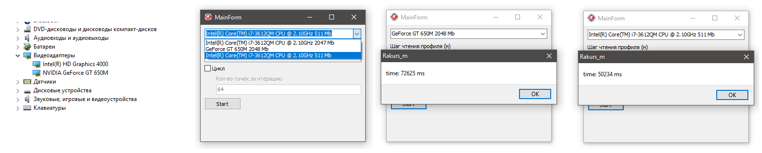 После перезагрузки в списке появился еще один i7 (но это с видюхой). Встроенная HD Graphics 4000 уделала дискретную GT 650M. Я теперь не уверен, с какой видюхой запускать тяжелые приложения и вообще нужна ли дискретная видеокарточка на ноутбуке. Пойду теперь качать драйвера и SDK Nvidia.