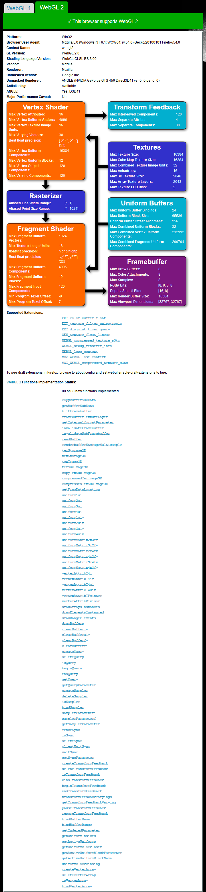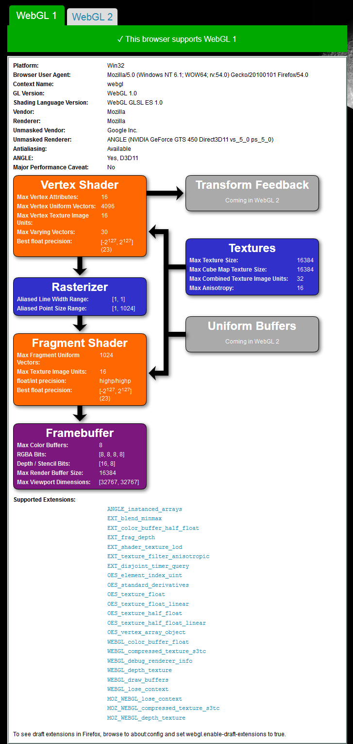 To see draft extensions in Firefox, browse to about:config and set webgl.enable-draft-extensions to true.