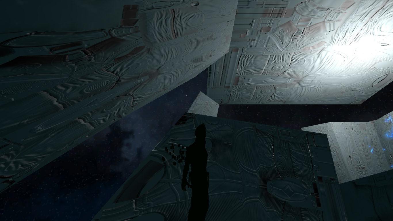 В итоге в обоих мирах появились порталы перехода и я собрал файлы в архив, чтобы побегать по прототипу могли и другие люди. Правда не все объекты являются твёрдыми, я не стал назначать коллизии на всё подряд, остановившись на основных - сама земля, всевозможные спуски и переходы, домики, некоторые стенки и так далее. Как и не стал перегораживать всё невидимыми стенами и заборами, чтобы не дай бог кто-то зашёл не туда, увидев изнанку уровня, просветы в геометрии и прочие артефакты - в конце концов это просто прототип.