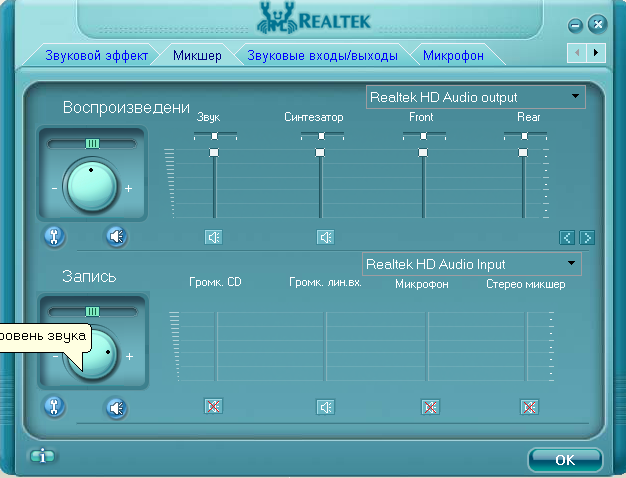 ползунка громкости микрофона тоже нет, но он работает (если включить в менеджере), меняется только общая громкость записи