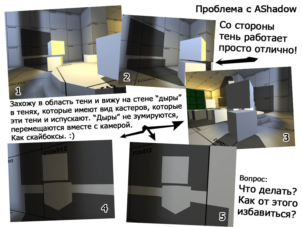 Есть комната. Есть источник света. Есть два куба. Один стоит на другом (но это неважно). Когда смотришь со стороны, то тень от этих кубиков выглядит просто на ура! Захожу в область тени и вижу на стене "дыры" в тенях, которые имеют вид кастеров (этих кубиков). "Дыры" не зумируются, перемещаются вместе с камерой. Как скайбоксы.