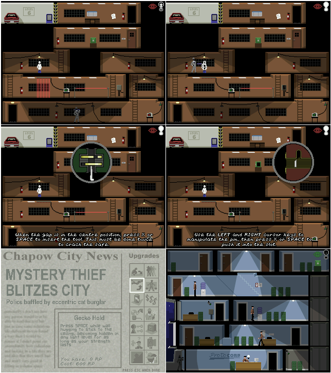 недавно наткнулся в на интересную игру- бегаем мужиком с шокером в зонтике по уровням, прячемся от камер и людей, вскрываем замки на дверях и сейфах, режем провода в электро-щитках, собираем все что плохо лежит. в игре куча бонусов, которые открываются по прохождению( скилы, разные костюмы.. ). есть сюжет, мини-миссии на уровнях.. звуковое оформление классное, анимации- супер.. вобщем отличная игра. минус- основное задание миссии иногда дается только в тексте (англ.)