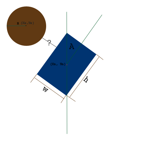 Народ, помогите решить такую подзадачку. Дан прямоугольник и круг, известны координаты центра круга (Xк; Yк) и радиус R. Прямоугольник повёрнут на определёный угол A. Даны ширина и длина прямоугольника (h и w), и координаты центральной точки прямоугольника (Хп; Уп). Нужно проверить, касается ли круг прямоугольника.