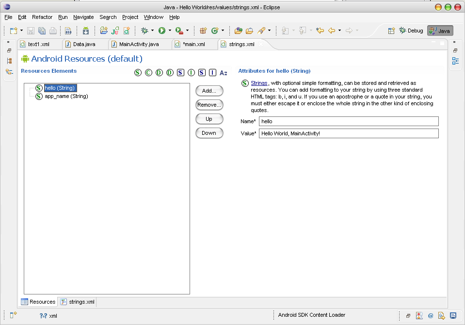 Проще говоря что мы можем видеть в данном файле разметки? У нас есть некий блок с линейной вертикальной разметкой элементов (LinearLayout) в котором содержится всего один элемент - некий TextView с текстом @string/hello. Эти странные собачки в тексте элемента говорят о том, что на самом деле выводимый на экран текст нужно искать не тут, а в файле с переменными res/values/strings.xml вот текст данного файла: