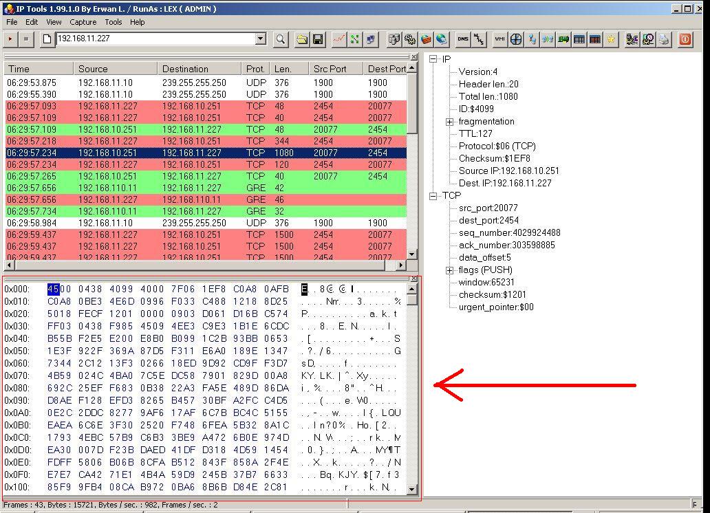 Есть программа IP Tools, в ней я пока не разобрался, но процесс идет. В ней я могу наблюдать как идет отправка и получение пакетов данных по TCP, а также размер в байтах этих пакетов...