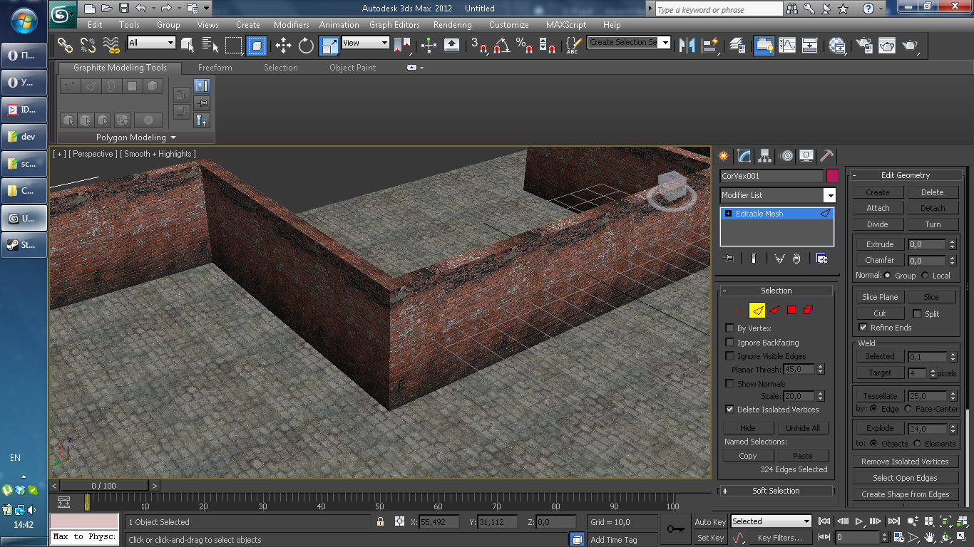Удали лишние полигоны, те что внутри стены, да и снизу тоже удали, их всё ровно никто не видит? может и поможет