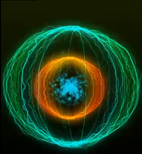 Мне кажется сделано так: Внешняя сфера реализована десятком спрайтов, сужающихся и растягивающихся по горизонтали вроде с анимированной окружностью в виде разряда (частицами похоже). Внутренняя сфера так же, а центр - частицы.