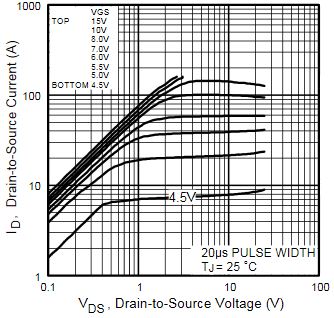 Тут каждая кривая дана для своего напряжения между затвором и истоком, как видишь при 5 вольтах максимальный ток ограничен 90 А что означает что транзистор полностью открыт т.к. максимальный ток у него 50 А. Следовательно транзистору подходит управление от 5 В - что логично - он ведь с материнки снят.