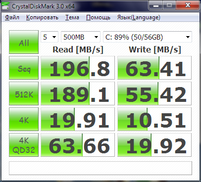 Как можно видеть из скриншота теста скорости, особенно впечатляющие показатели в скорости чтения мелких файлов и чтения файлов с глубиной очереди до 32 запросов одновременно. Единственный минус - невысока скорость линейной записи, однако тут следует учесть что SSD тем меньше показывают скорость чем меньше свободного места осталось на диске. Тестировался же винт с перенесенной туда системой, и 89% использования ёмкости.