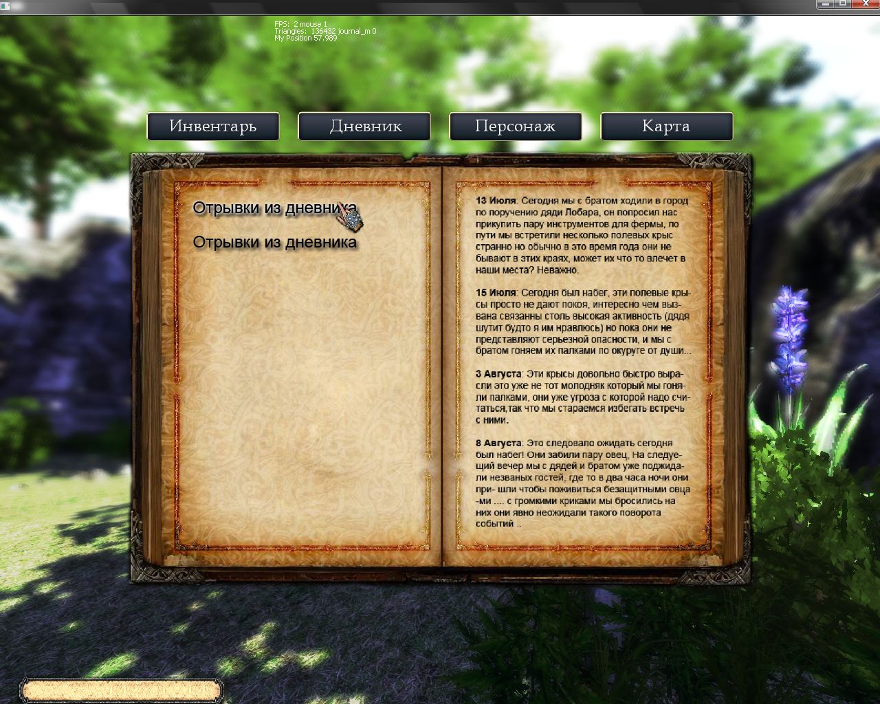 На данный момент частично готов уровень, игрок ходит по нему ну коллизия,шум ходьбы и т.д, всплывающие сообщения о но хождении той или иной локации как в Oblivion.