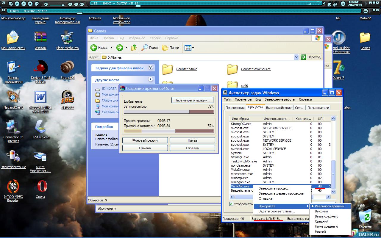 Раньше думал (и видел на практике), что если дать процессу приоритет раального времени, то он загрузит процессор на 100%, и ни с кем процессорным временем делиться не станет. А тут наблюдаю такую картину: ставлю WinRAR'у при сжатии приоритет реального времени, а процессор как был загружен на 50-60%, так и остался. Почему так?