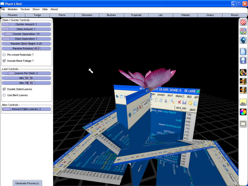 Люди штампуют подобный софт сотнями экземпляров. Подобие этой проге - Treegenerator. Вот только я не помню, вроде чуть дешевле стоит. Предназначена для создания деревьев, но умело исхитрившись на ней можно делать и цветы. Хотя у мя какие-то розовые пальмы получались о_0. В ней один только плюс - безболезненно для системы и психики ломается.