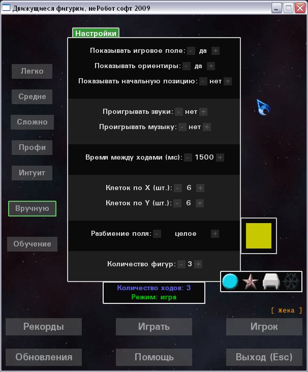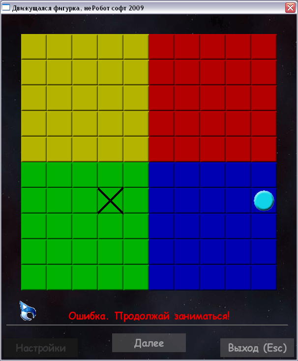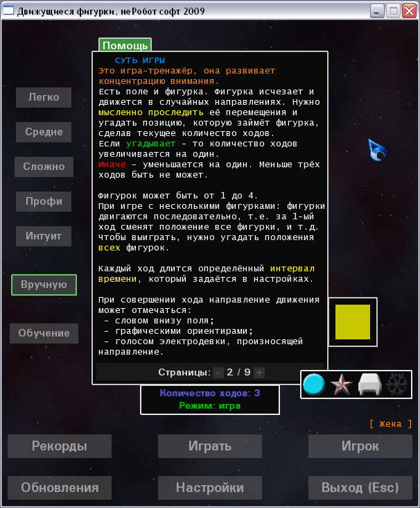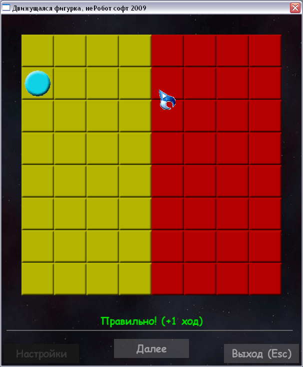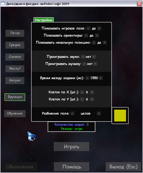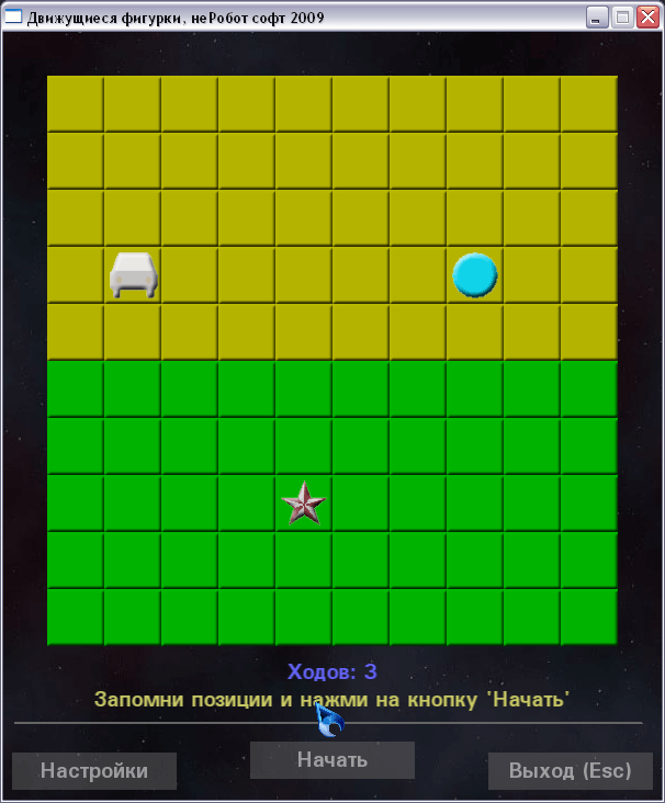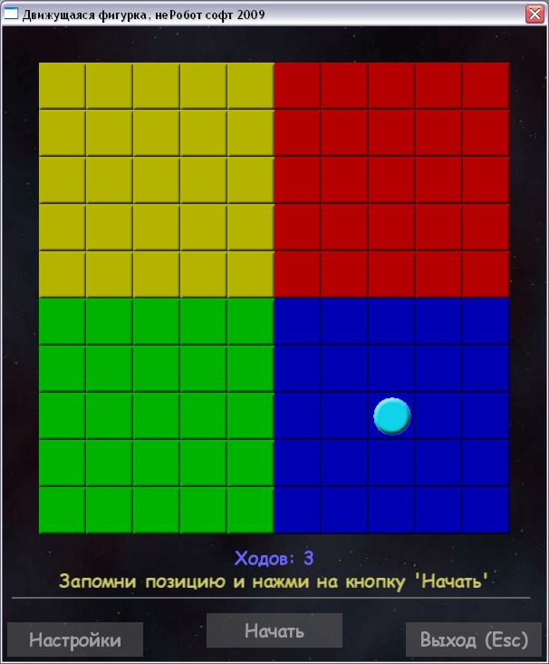Суть игры: есть игровое поле из клеточек, есть фигурка. Игроку нужно запомнить начальную позицию фигурки. Затем фигурка исчезает, и начинает двигаться в случайных направлениях. По истечении определённого количества ходов она останавливается. Игроку нужно угадать - где теперь находится фигурка.