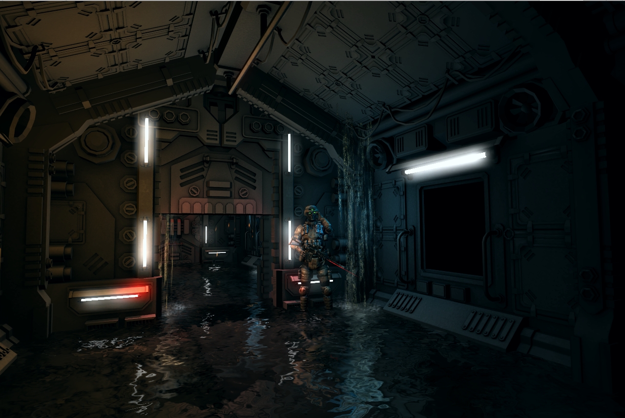 Как это будет играться, вы оказываетесь допустим в коридоре, уровень воды поднимается вы должны открыть дверь (которая аварийно закрыта, горит красным цветом),ага похоже поврежден кабель (который искрит) но вода уже по шею, пара мгновений и вас убило током  , поновой, ага оказываеться можно было включить откачку воды в консоли глав. коридора, воду не откачает но поможет выйграть время пока вы залезете на ящик и обесточите проводку .... соедините и т.д