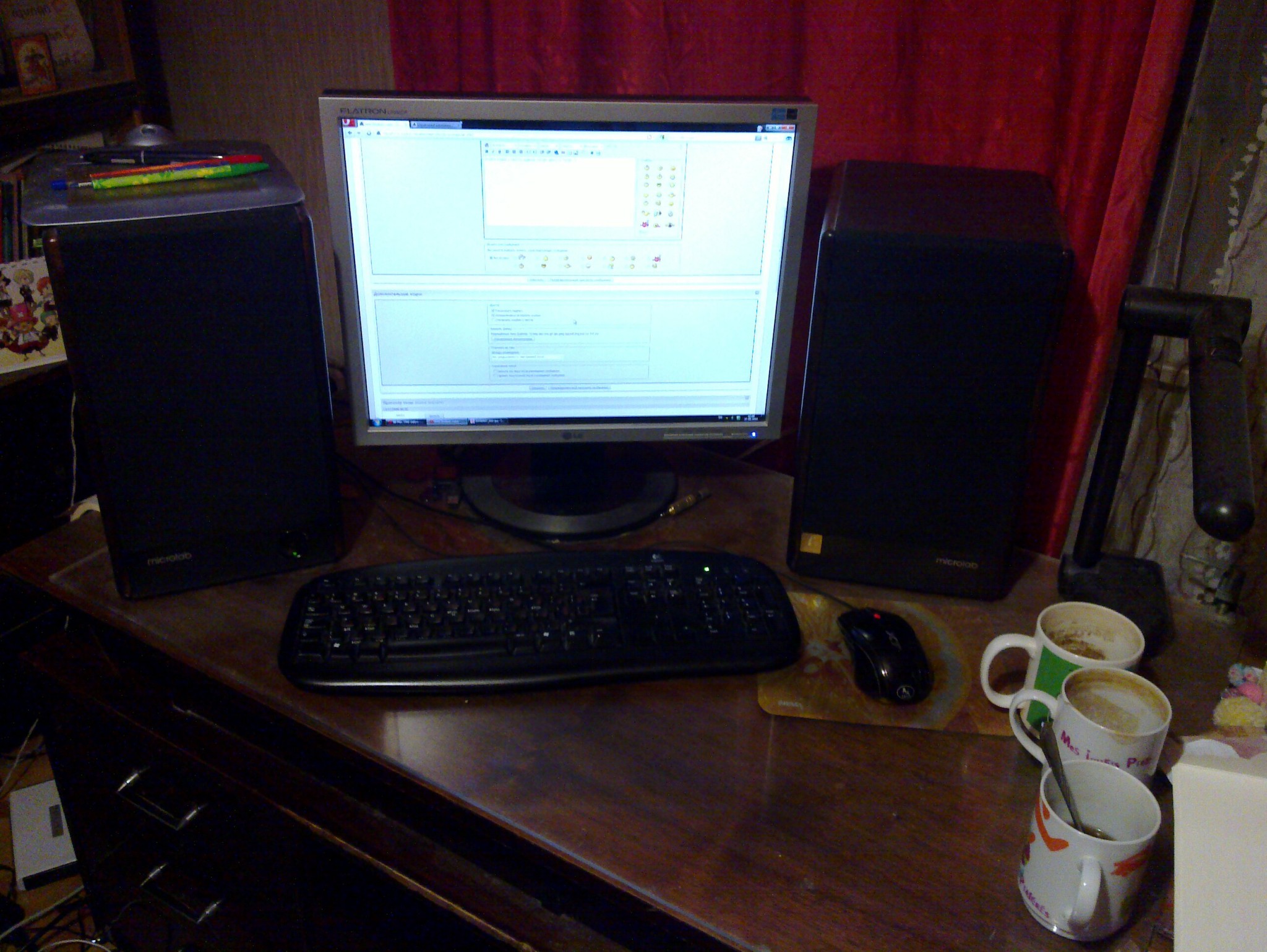 Вот и моё местечко, не слишком и уж круто, но удобно и ноги не на полу, и ковёрчик, у нас из тетрадки по физике 9кл. и скотч-бумажный. Ну что мона ещё добавить, ну Грызун, светится, ай какой породы непомню, моник - Гов*о  . Стульчик крутящийся, на Н-ое количество оборотов, с возможностью регулировки высоты сиденья, глубины спинки, и спинка подстраивается под наклон вашей спины. Из окошка вид на дворик.