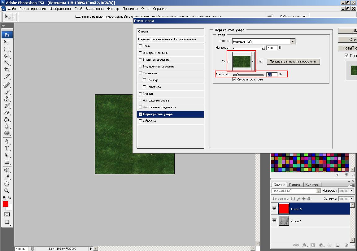 8 )Настраиваем теперь.Масштаб делайте по вкусу(тут можно поиграть с его параметрами ).Узор выбираем нашу траву.