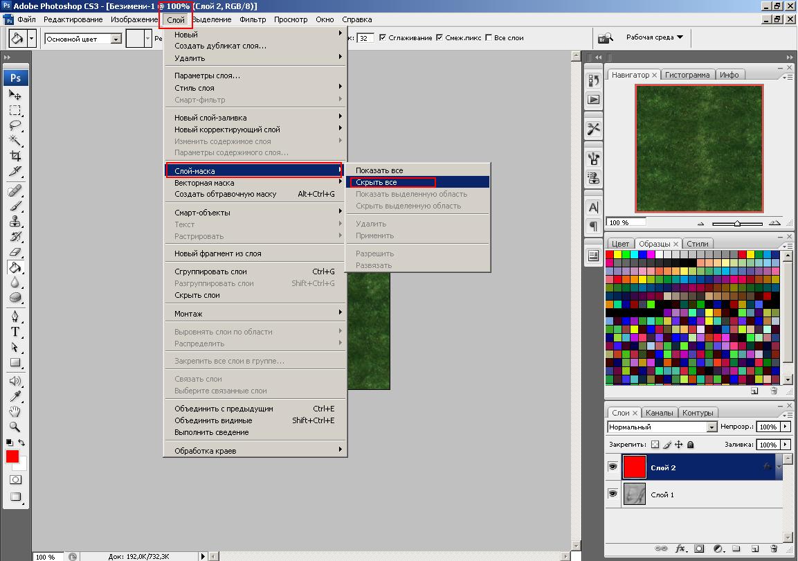 Слой->Слой-маска->Скрыть Все. Все скрыли слой,поставили маску.